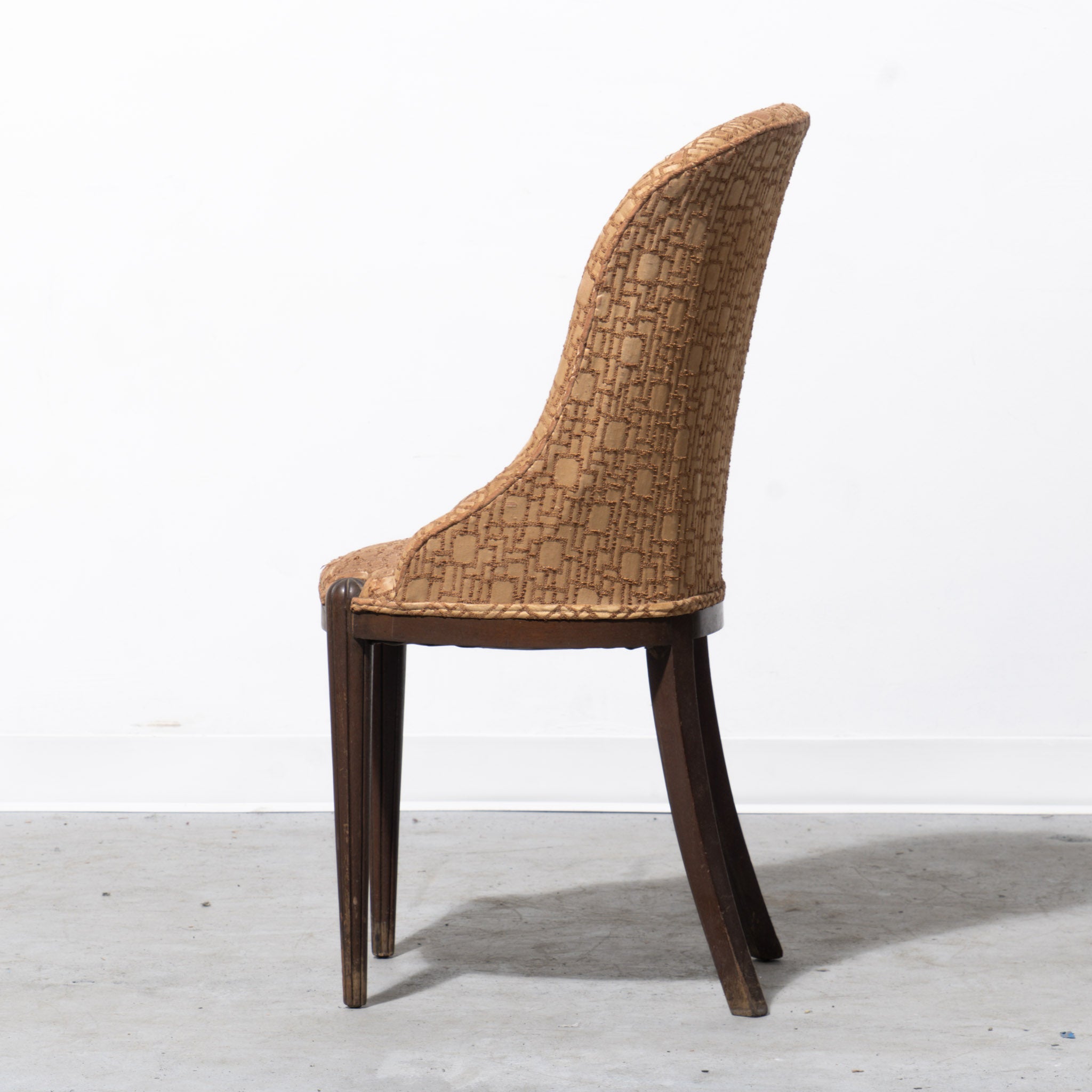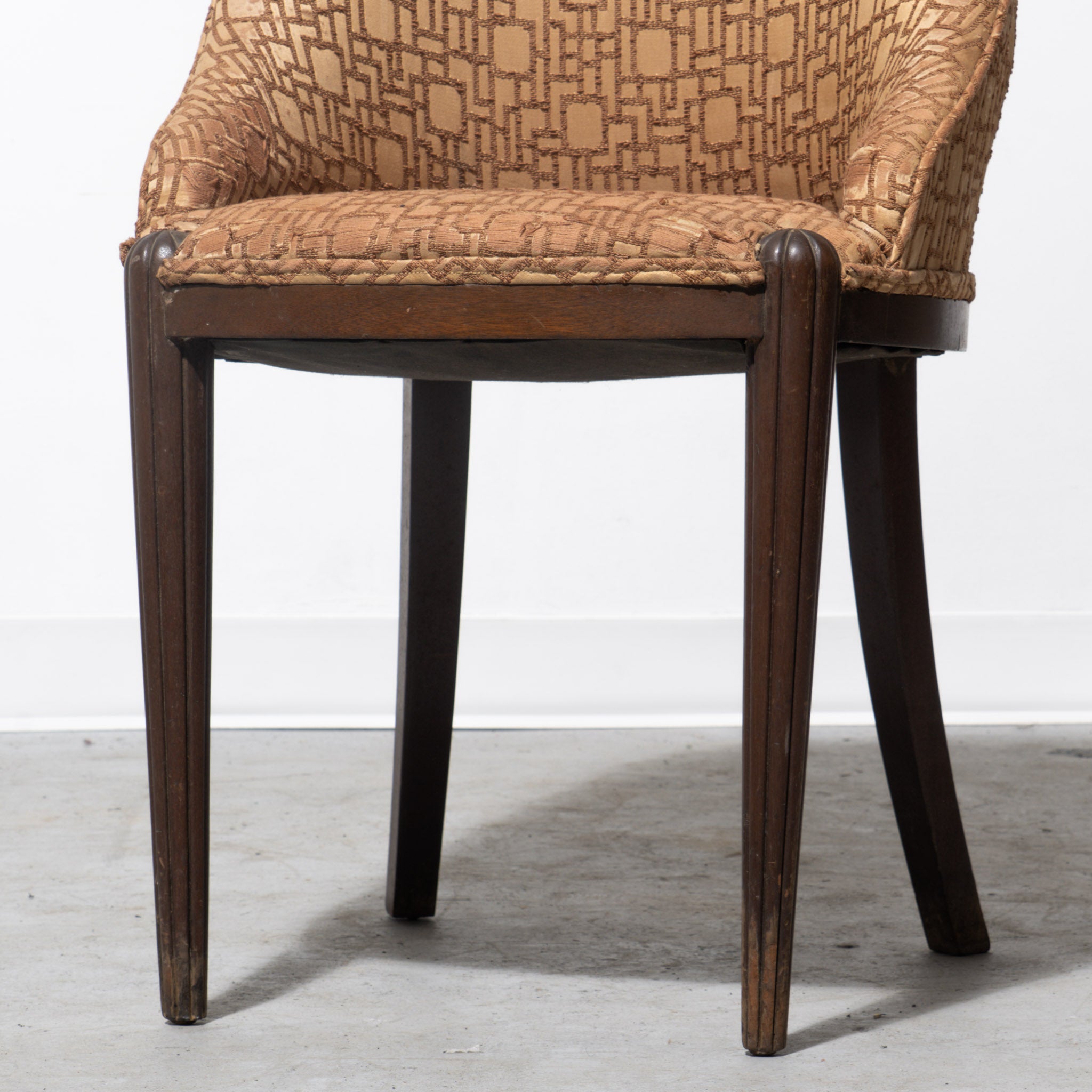 Perfectly patterned. Art Deco upholstered side chair with walnut wood frame, featuring tapered fluted legs and carved rosette corner detailing in a dark brown finish. Upholstered seat and curved back in textured geometric jacquard fabric in warm tan and caramel tones.