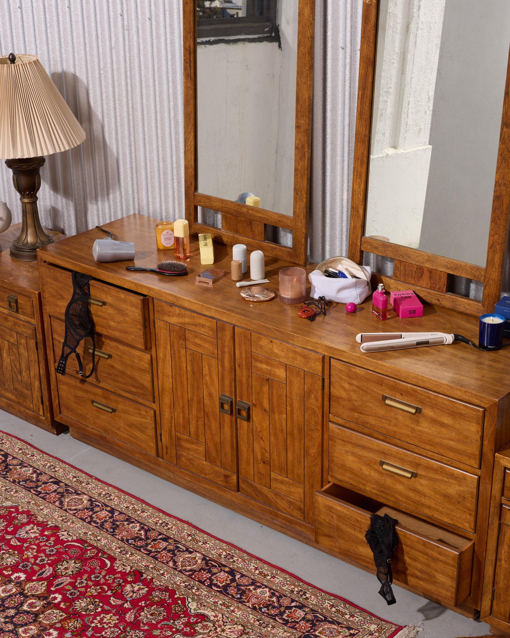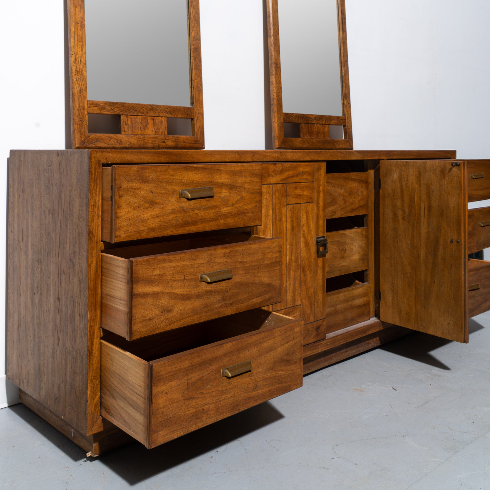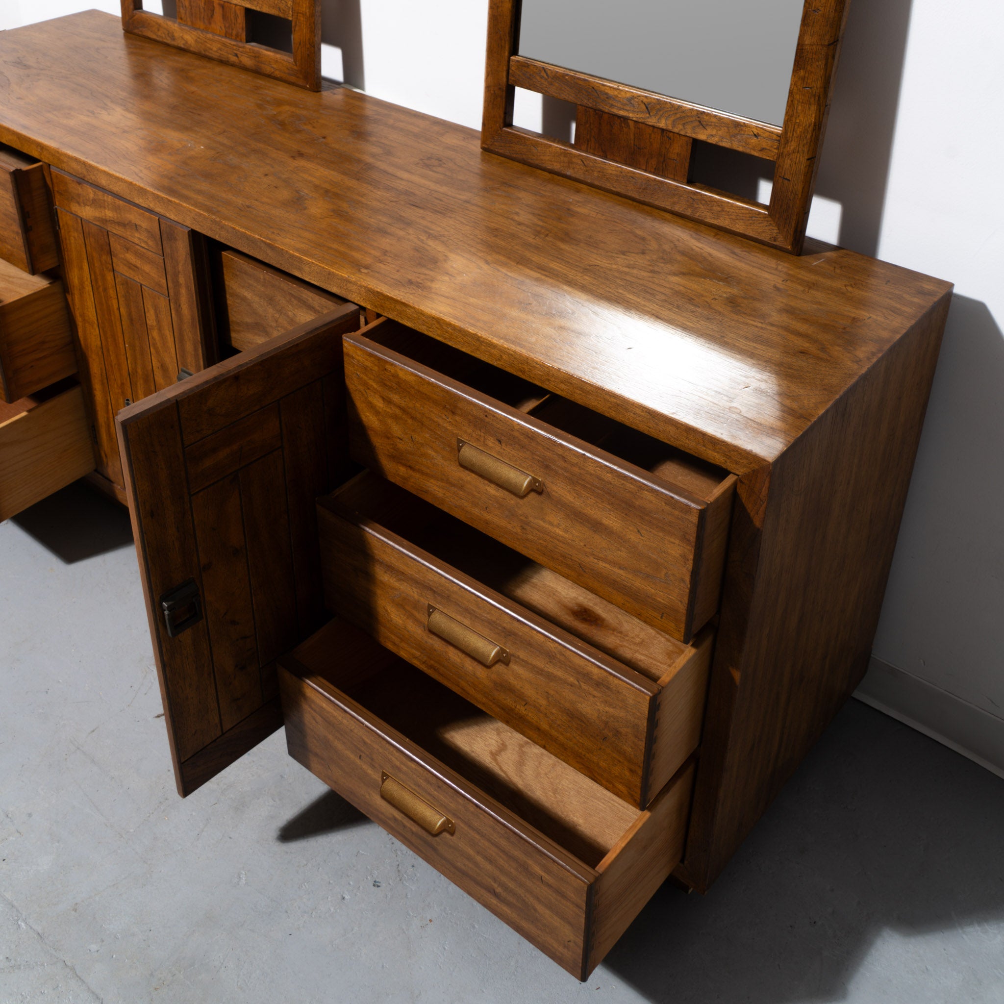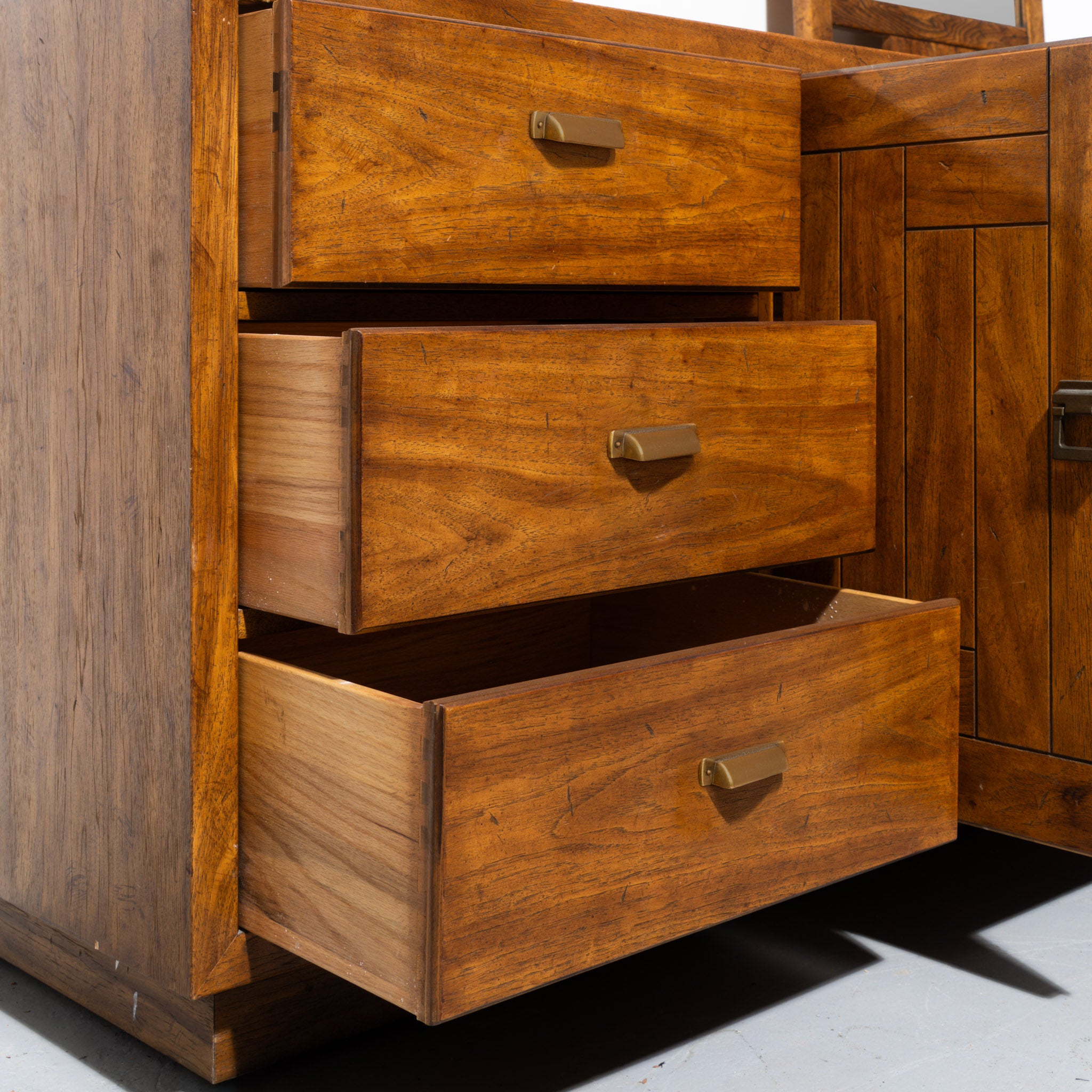 No lowballing here. 1970s mid-century Drexel Heritage lowboy dresser from the campaign-style “Woodbriar” collection. Made of solid pecan wood with brass hardware, featuring six drawers and a central double-door cabinet with geometric parquet paneling. Cabinet opens to three interior drawers. Pair with our matching wall mirrors to create the ultimate bedroom vanity. 50% off estimated retail.