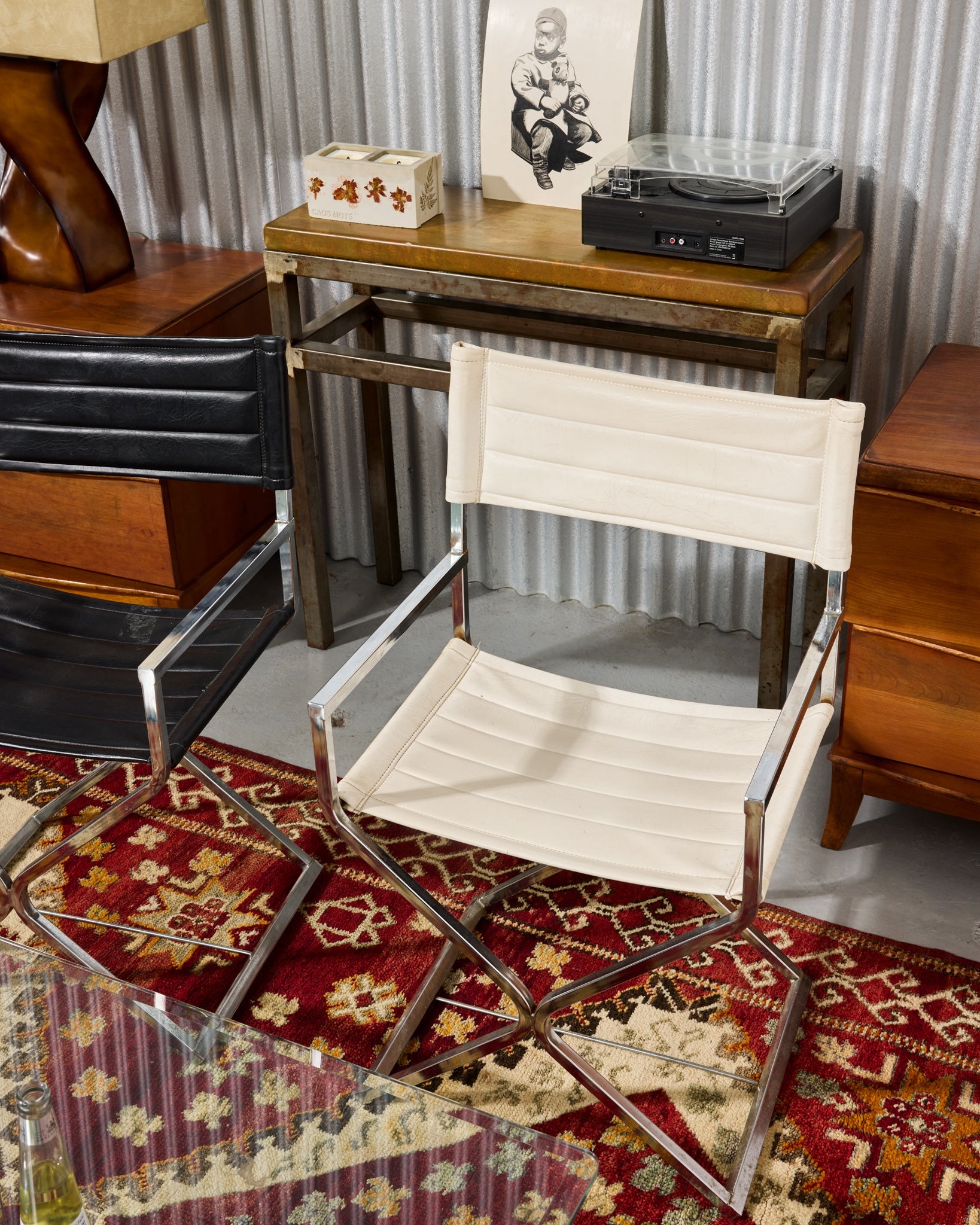 In case you needed another opener to talk about your Letterboxed account. 1960s director chairs attributed to Robert Kjer Jacobsen for Virtue Brothers. Lightweight polished chrome x-base frame wrapped in re-painted white stitched vinyl. Pair it with our black version to really impress your Hinge date.