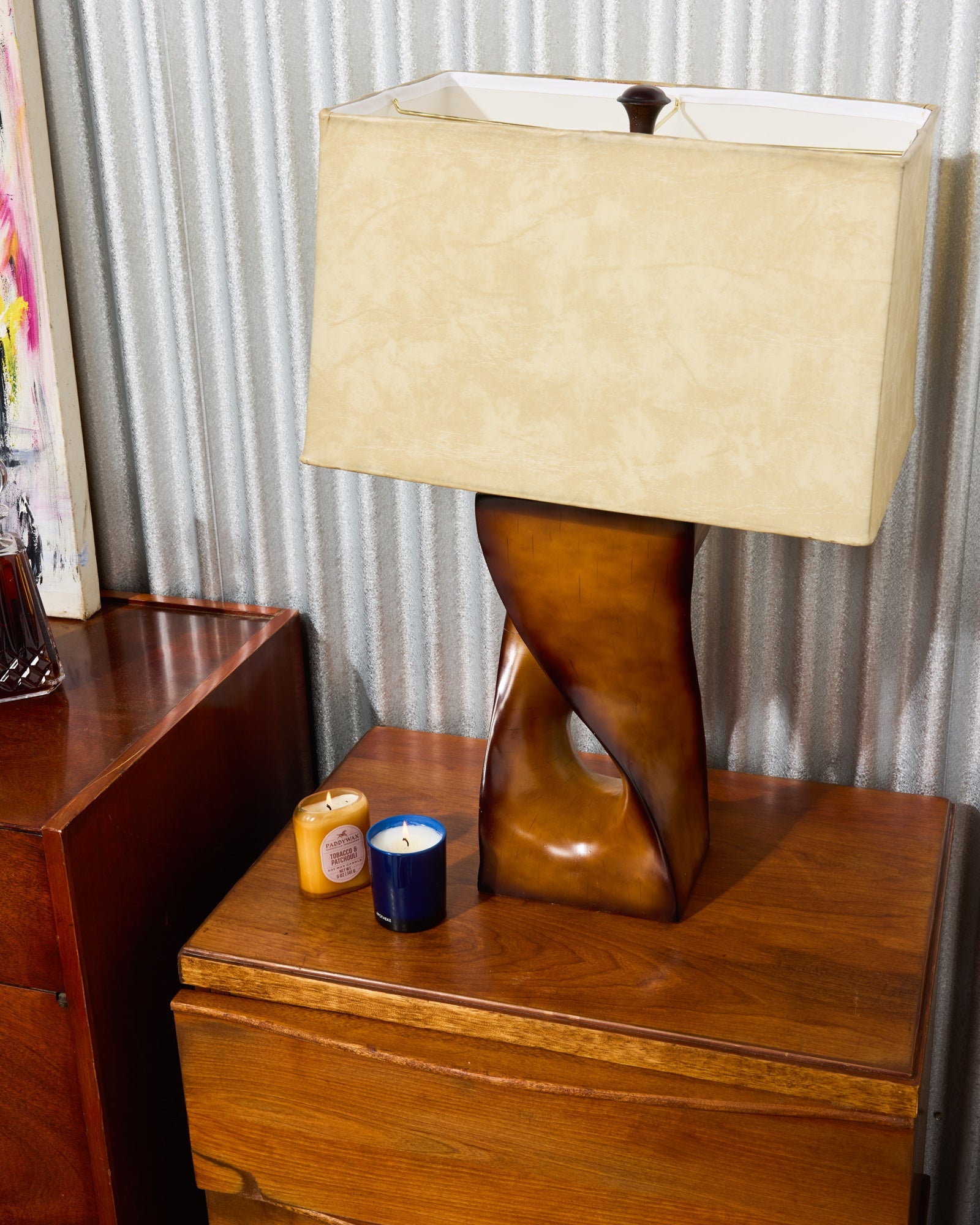 The definition of functional art. Pair of table lamps featuring beige textured rectangular shades and spiraling bases carved out of solid hardwood. Radiates golden gradient hues you won't want to take your eyes off of. Priced individually.