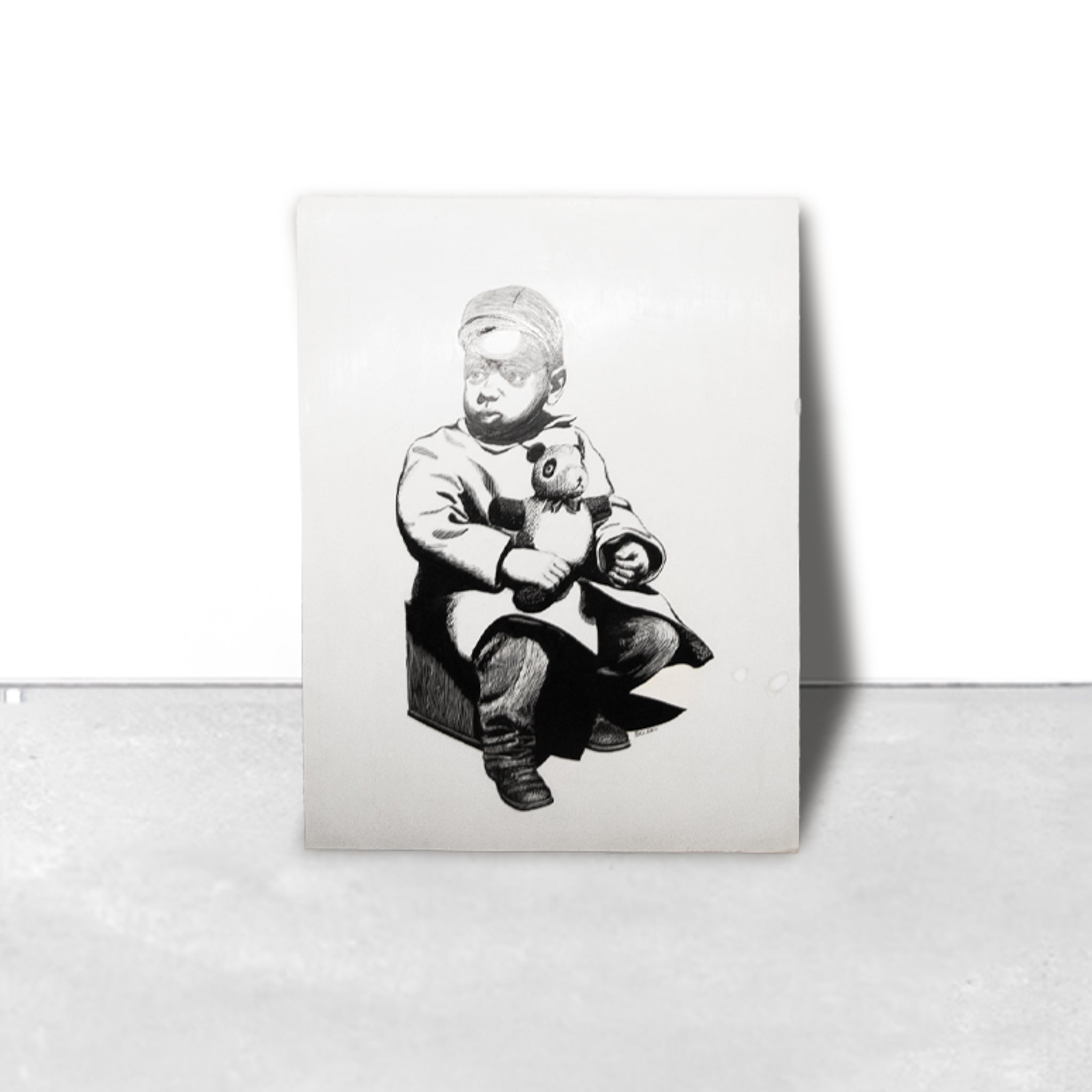 Adorable! Newly framed black and white etching of a child and teddy on scratchboard. Original signed by artist.