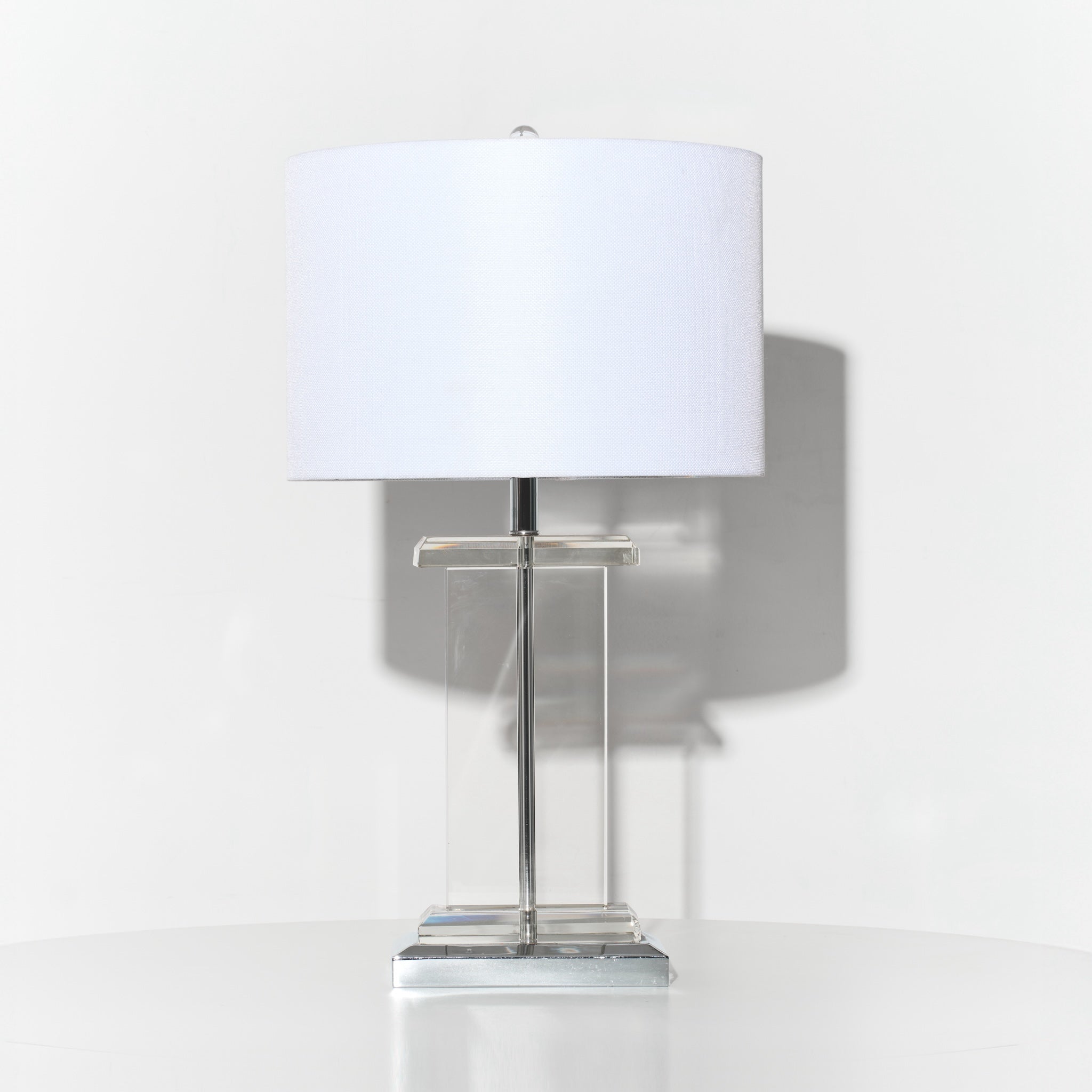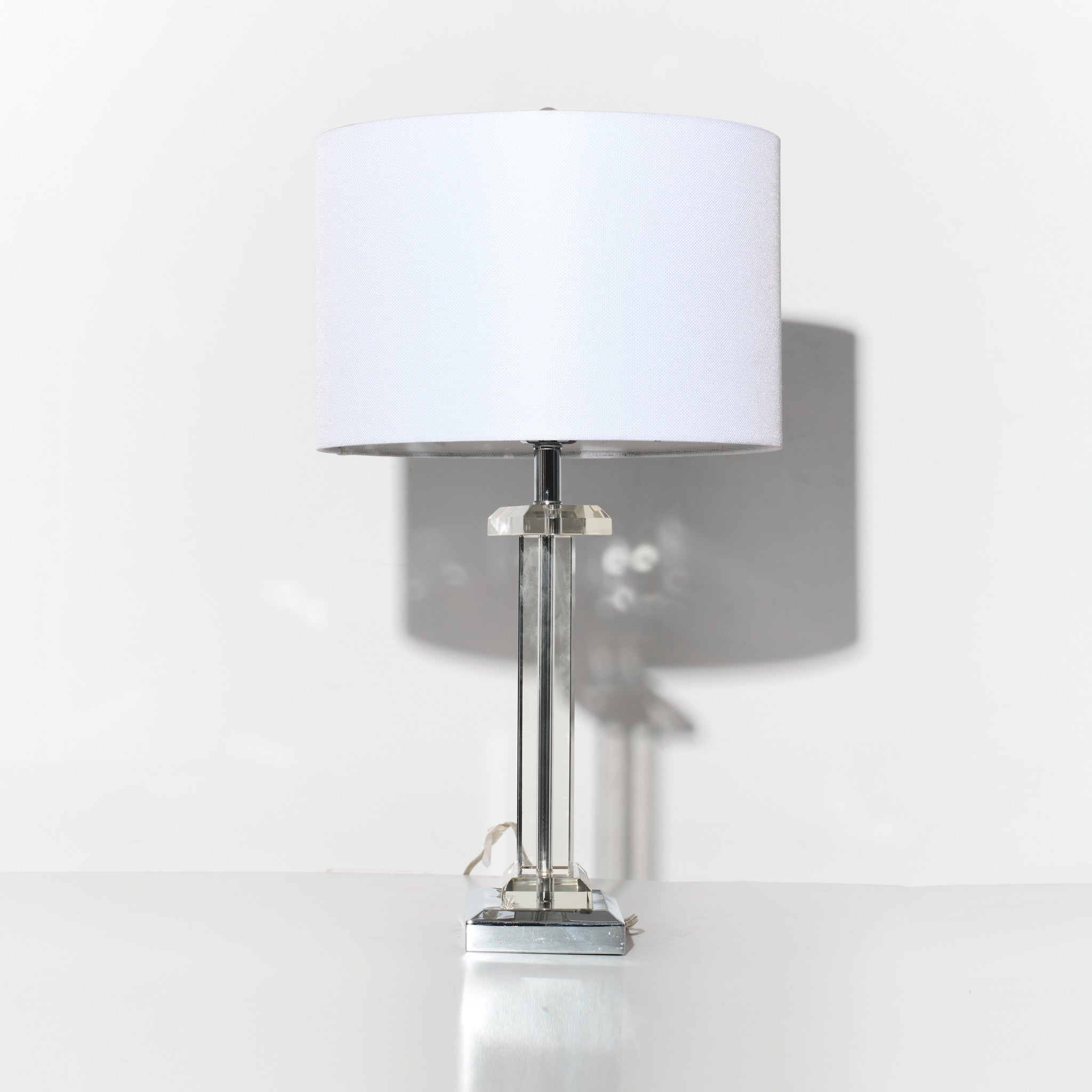 Clearer than where your current situationship stands. This table lamp features a sleek rectangular glass column base with chrome accents and a crisp white shade.
