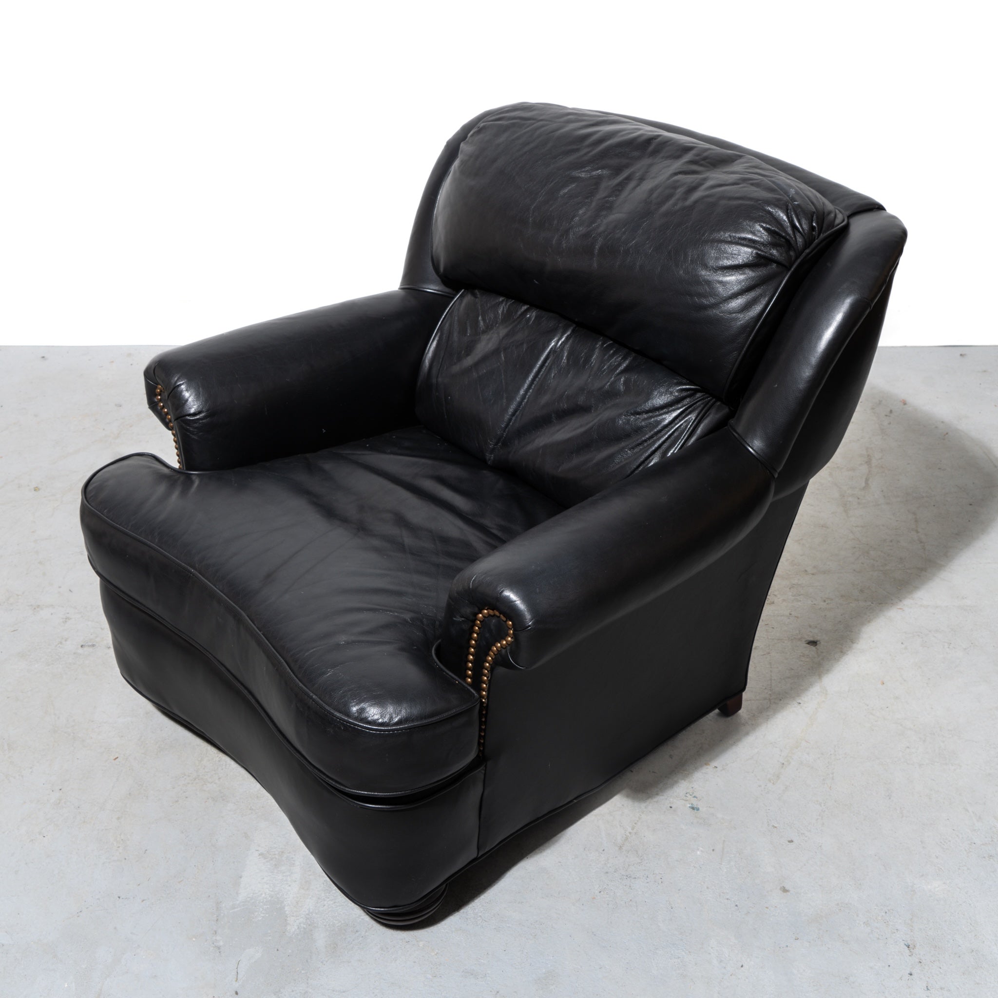 For your (wo)mancave. HickoryCraft armchair wrapped in buttery black leather and finished with classic nailhead accents. 70% off estimated retail.