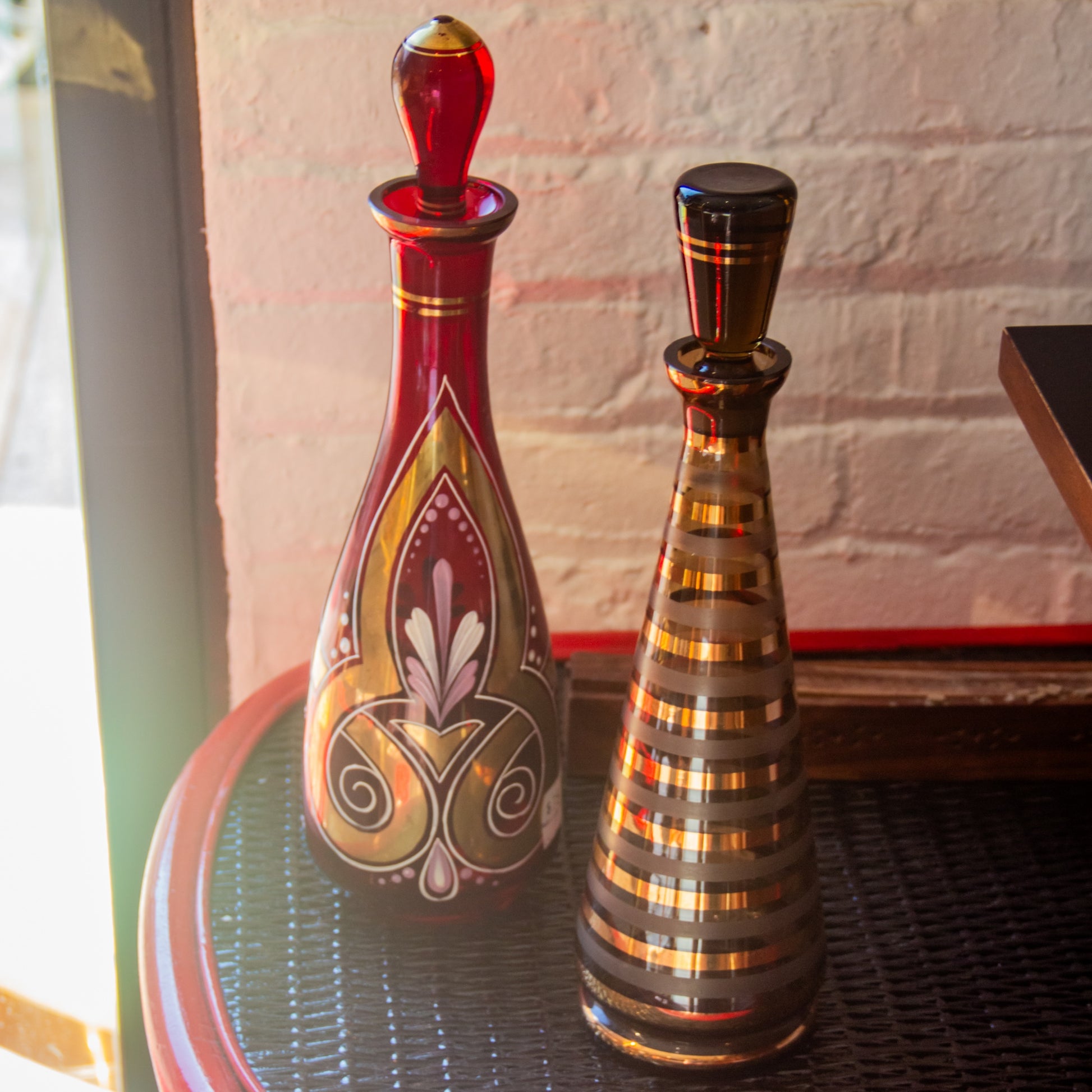 Another addition to your at-home bar. (Or a reason to start to making one.) Mid-Century Modern smokey and gold striped painted glass decanter with stopper.
