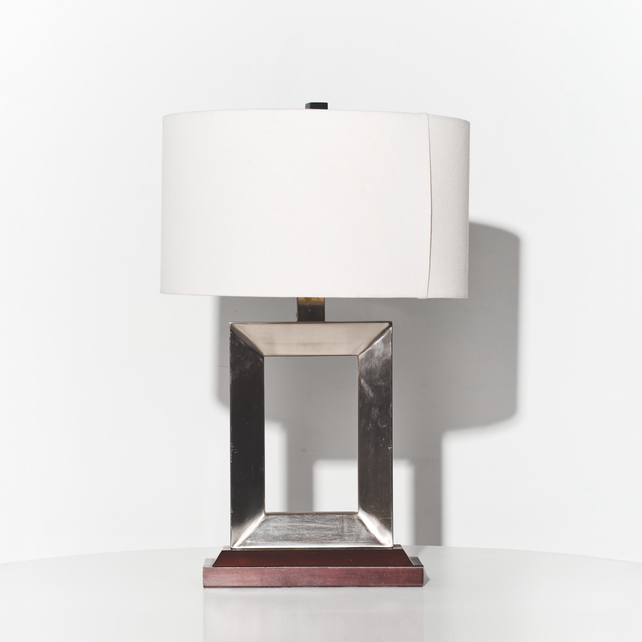 "I like MCM." Mid-century modern table lamp with a bold geometric square base in polished metal, standing on a wooden pedestal and paired with a crisp white drum shade.