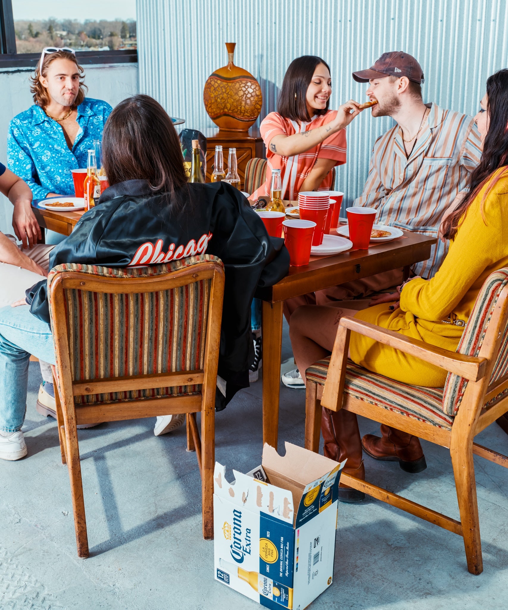 The type of chair every Hinge guy claims to appreciate. MCM armchairs upholstered with beige fabric and strips of gold, red and green velvet. Priced individually. Pair with the matching dining chairs to bring actual mid-century modern cred to your space - not just dating app personality.
