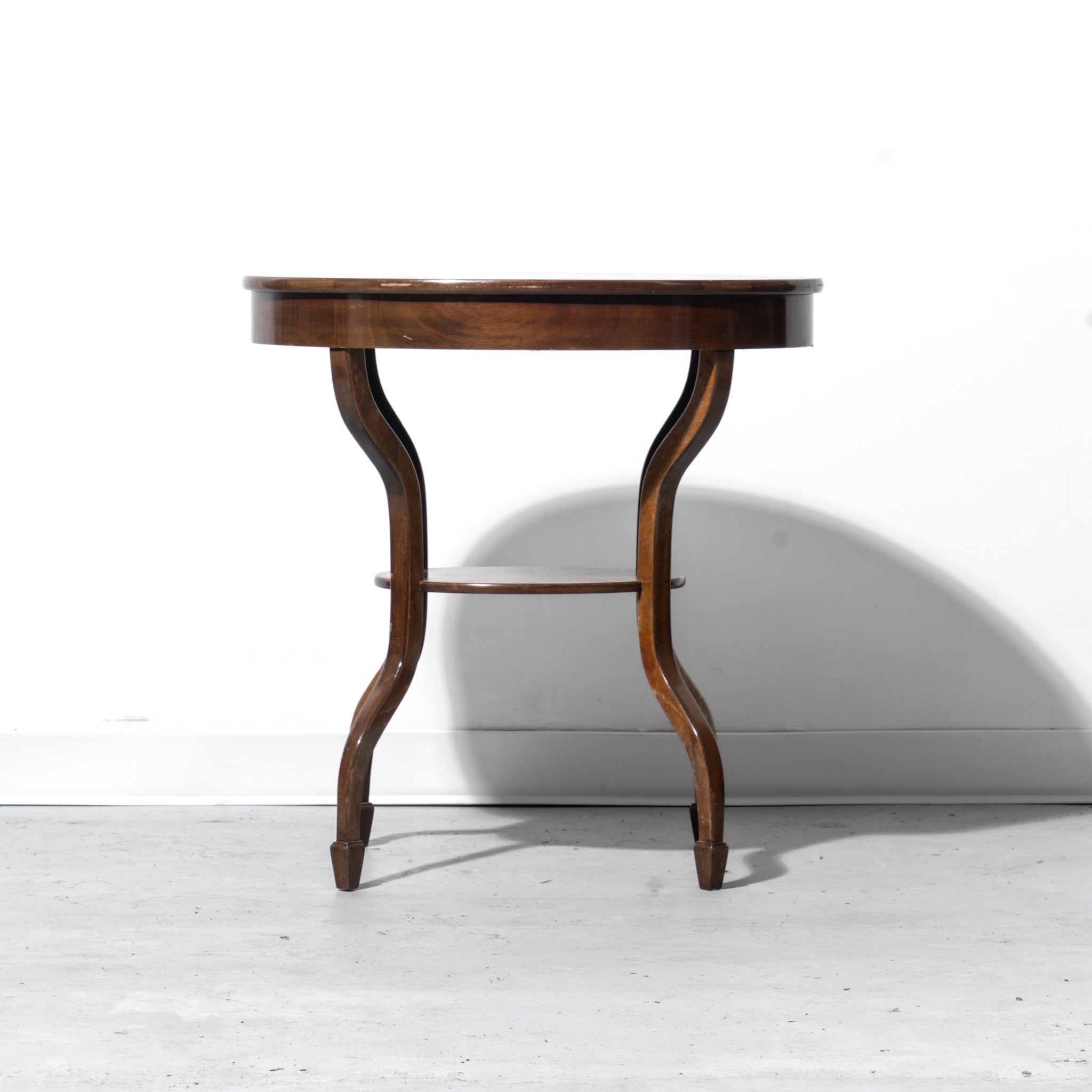 When you can't choose a favorite wood. Oval side table crafted with mahogany veneer wrapped with a contrasting inlaid maple burl, laminated bentwood legs, and a lower shelf. Constructed on a solid wood structure for durability and stability.