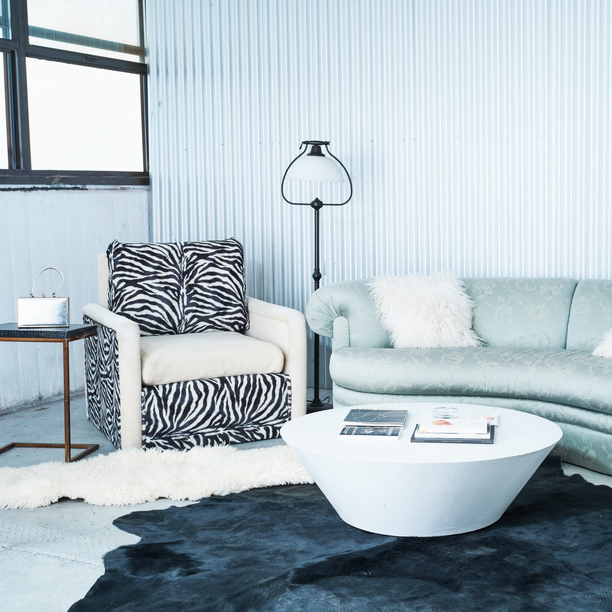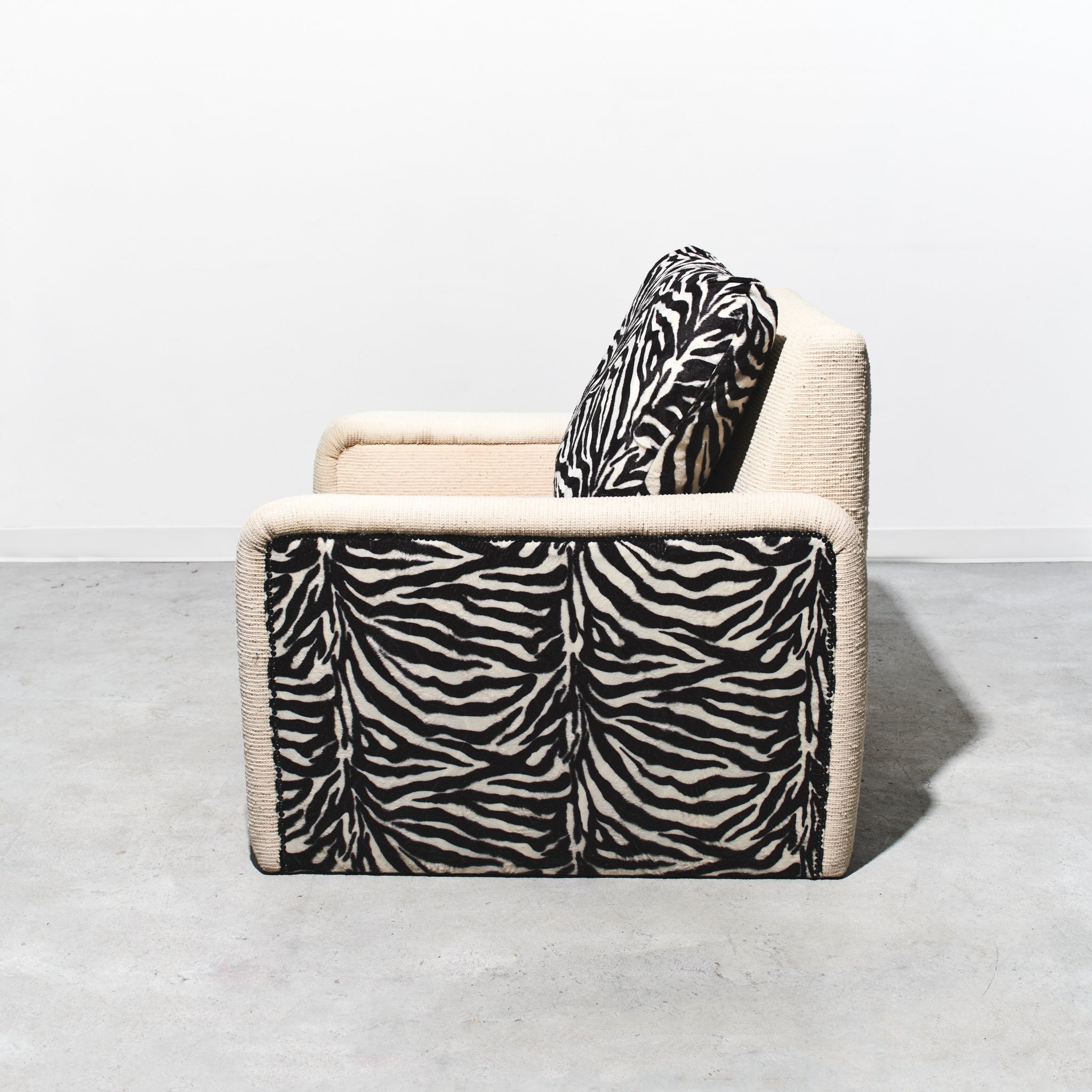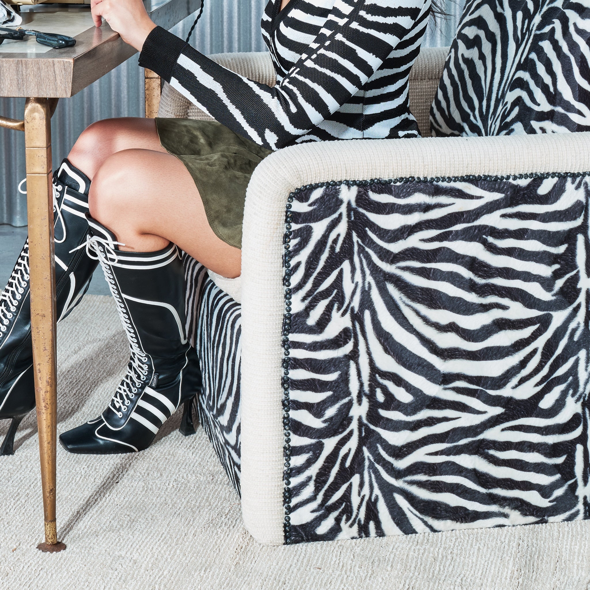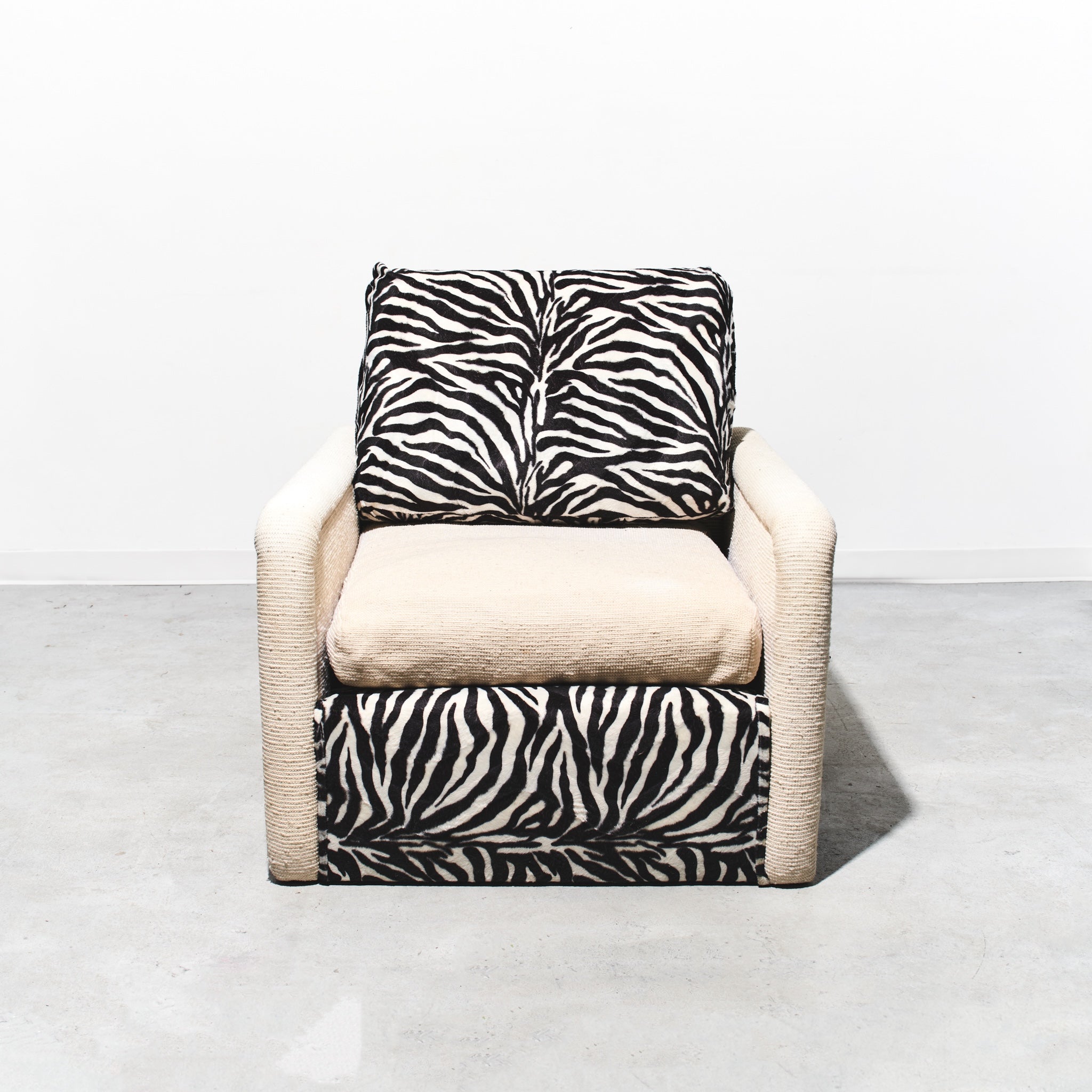 Great: Minor discoloration and pulling on cream fabric. New Zebra upholstery.