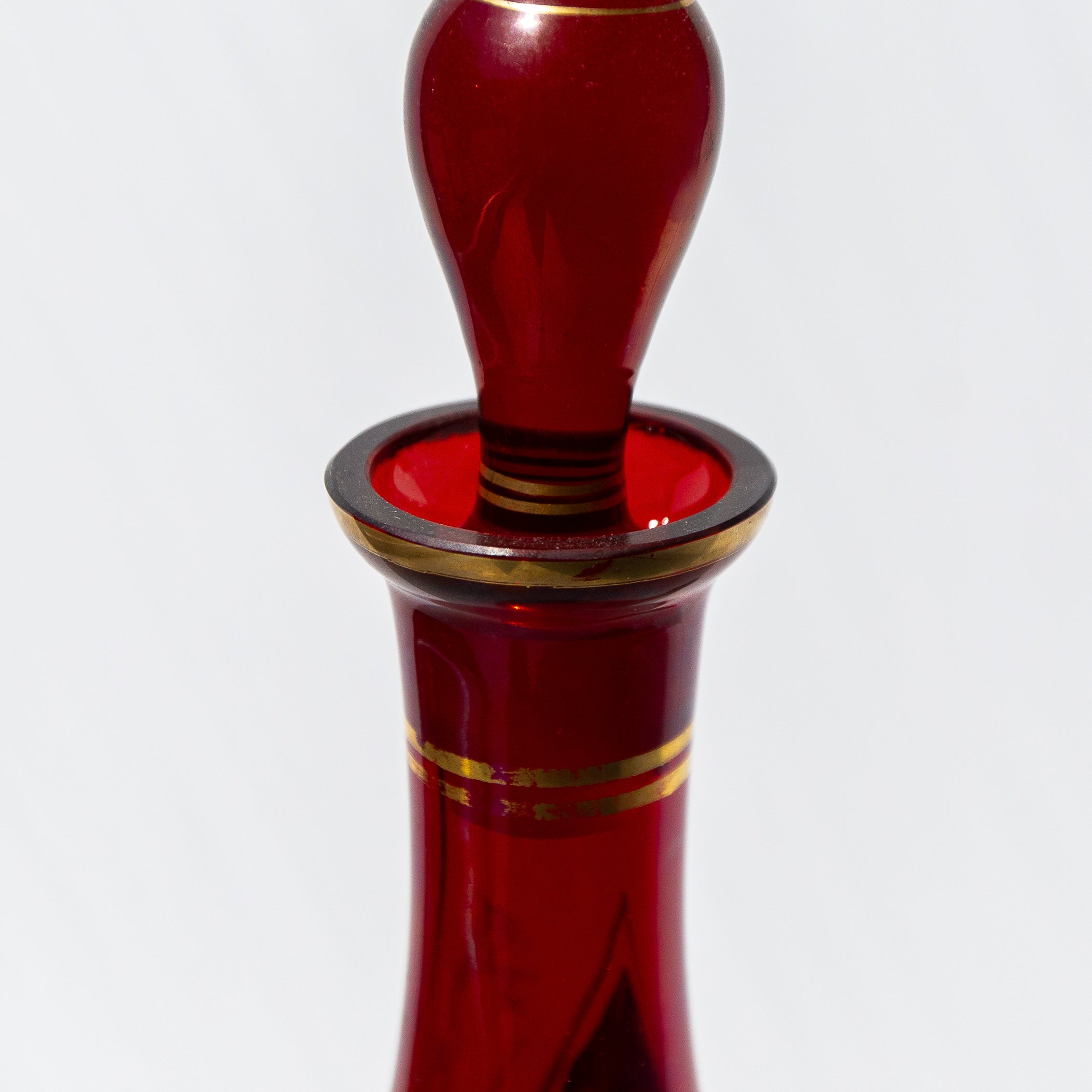 Discover vintage charm with our Pair of Bohemian Ruby Glass Decanters, gilt and paint decorated. Circa early 1900s. Mid-century modern hand-pained Bohemian glass decanter with stopper.