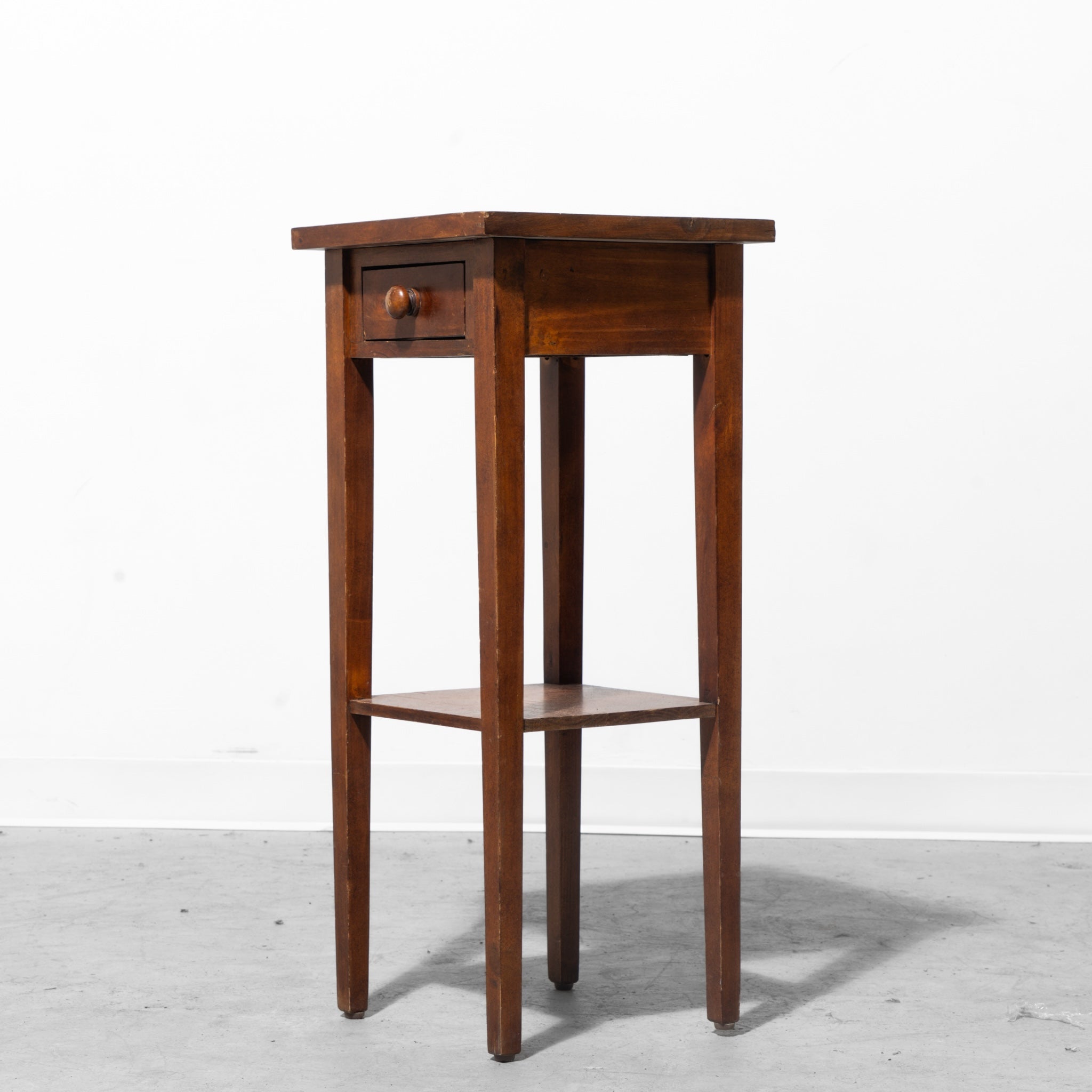 For your favorite plant or entryway keys. Vintage small side table / plant stand crafted from knotty pine with inlaid tiles made from coconut shells on top. Features a single drawer and lower shelf. 60% off estimated retail.